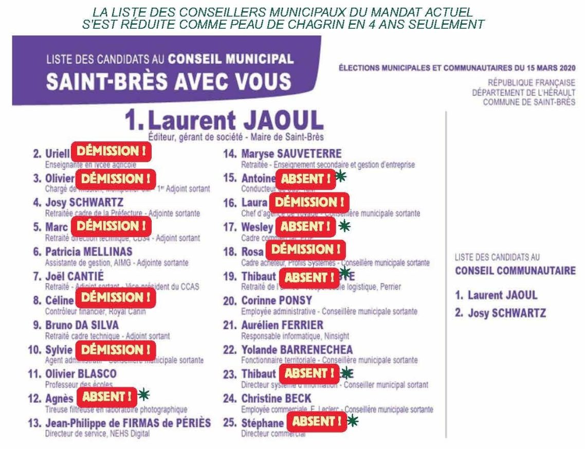 - des élus qui démissionnent successivement et d'autres qui ne sont pas ou plus présents aux conseils et aux événements