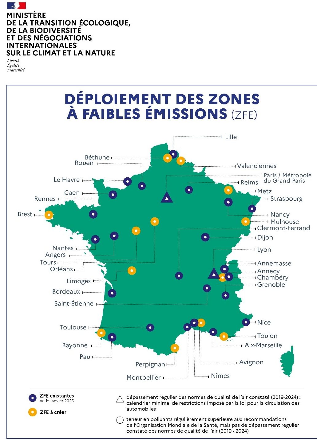 Depuis la loi « Climat et Résilience » du 22 août 2021, toutes les agglomérations françaises de plus de 150 000 habitants (soit 43 métropoles ou grandes aires urbaines) devaient instaurer une Zone à faibles émissions mobilité (ZFE-m) d’ici le 1ᵉʳ janvier 2025. Les grandes villes et métropoles concernées sont :